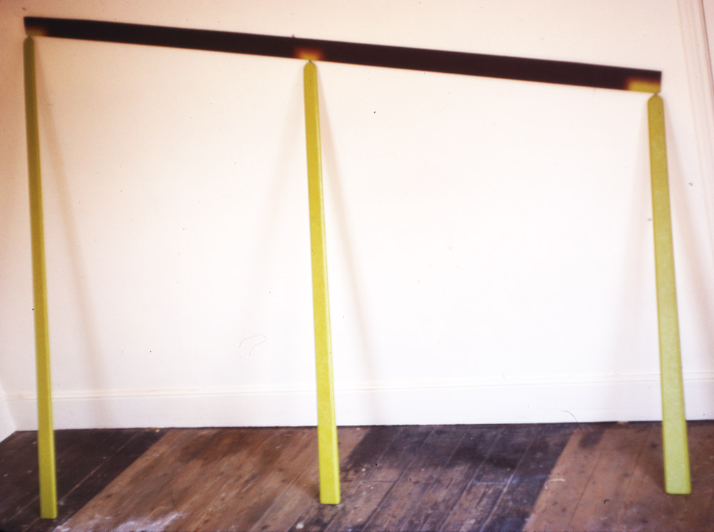 Four Connected Pieces is one of a number works where I was exploring aspects of painting linked with physical space, yet not defined as sculpture. This idea was to some degree influenced by De Stijl, and Mondrian's interest in the idea of the 'abstract interior'. A recent visit to an exhibition about De Stijl, in Eindhoven, has reawakened that interest, although the idea of a whole work interacting with a complete space has been an unresolved issue that still interests me. The series of wall/floor related pieces use conditions of balance – imbalance, inflection, change into movement and energy - works which link painting, colour and physical structure. I was then preoccupied with that synthesis, of painting, sculpture, colour and space. Works by Anthony Caro, Phillip King, etc, evoked these sensations, particularly a sculpture by Caro, shown in the Kasmin Gallery, a horizontal yellow painted piece that filled the gallery space.
