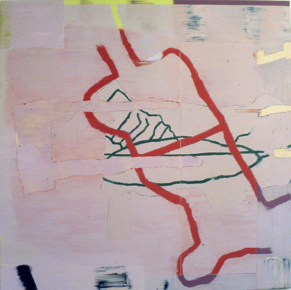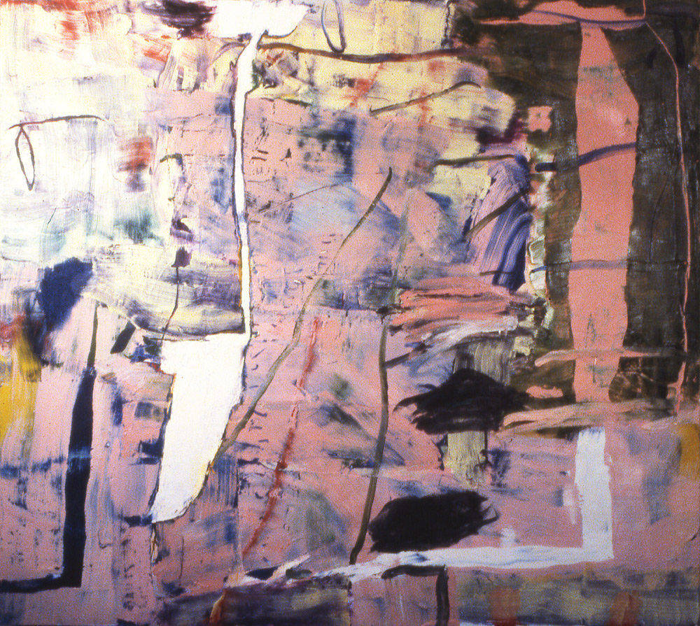 Two Pinks was shown in a solo exhibition at The Bend in the River, Gainsborough, in 1997. It was painted using a combination of wax (beeswax) and oil paint, which would build up and generate an active density and physicality of marks and surface. Drawings in notebooks, direct responses to the insignificant, the banal, the transitory, sound, memory, acted then, and continue to act as a reservoir of images which feed into the work. The process of accumulating layers was and is a result of the work emerging from a complex series of decisions, considered or spontaneous. Drawing provided an impulse, a source – the painting would take its own form. The work then has to mutate and reconfigure until at some point I recognise a moment to stop.
